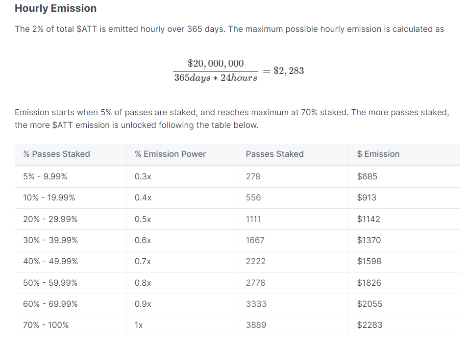 토큰 분배 방식이 재미있는데, 스테이킹하고 있는 물량에 비례해서 $ATT Emission Power가 달라진다는 점이다. 더 많은 Pass NFT가 스테이킹 될수록 더 많은 양이 지급되므로, 홀더들에게 스테이킹을 유도하는 식으로 설계되어 있다.