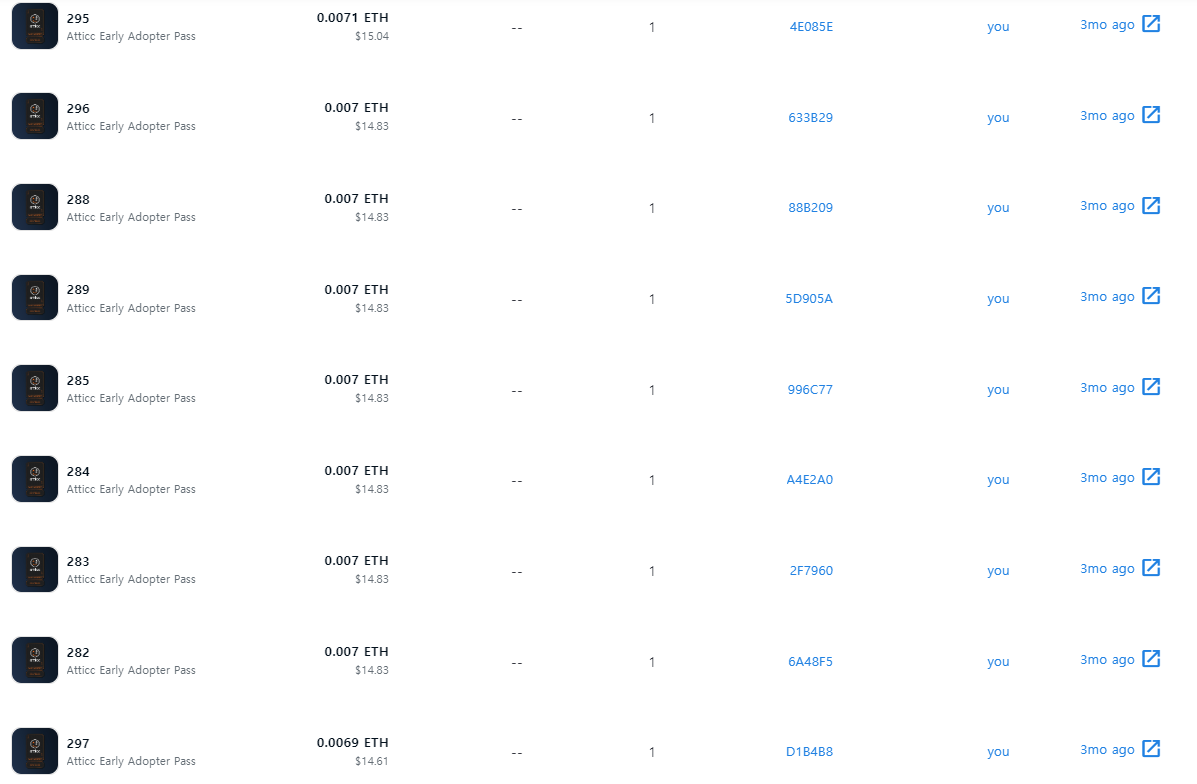 나는 0.007ETH 정도의 가격으로 10개의 Atticc Adopter Pass NFT를 구매하였다.