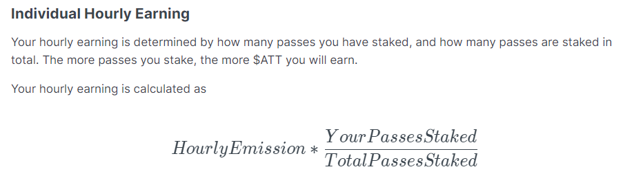 증가하는 Emission Power의 양보다 Staking되는 Pass NFT의 비율의 기준 속도가 더 빠르기 때문에 실제로 '시간 당 지급받는 $ATT 토큰 수' 자체는 줄어든다.