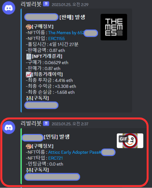 리빌리 봇은 일명 'NFT 고래 추적 봇'으로 흔히 큰 손으로 불리는 지갑들을 리스트업 해두고, 해당 지갑에서 Transaction(거래)가 발생하면 바로 디스코드에서 Alert를 뜨도록 구현하였다.