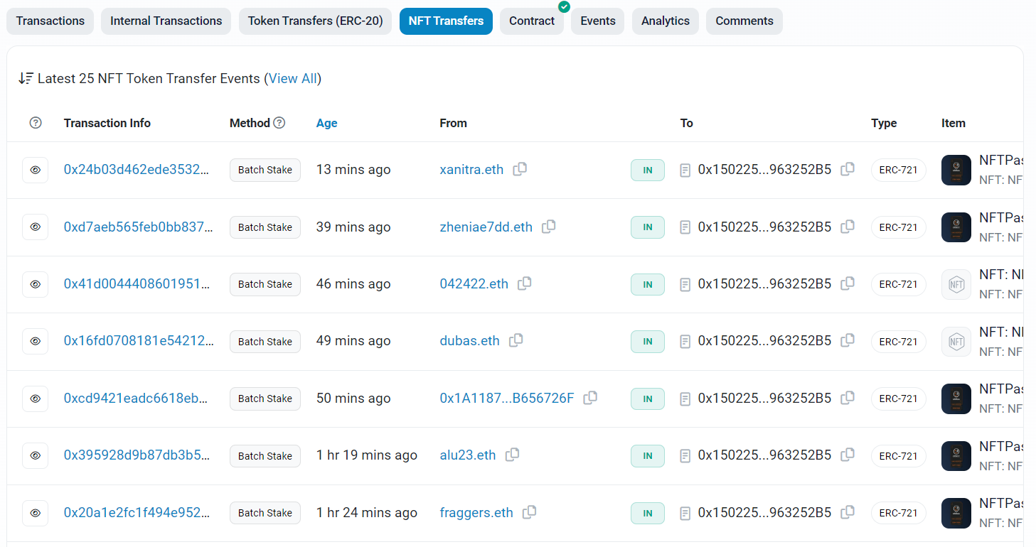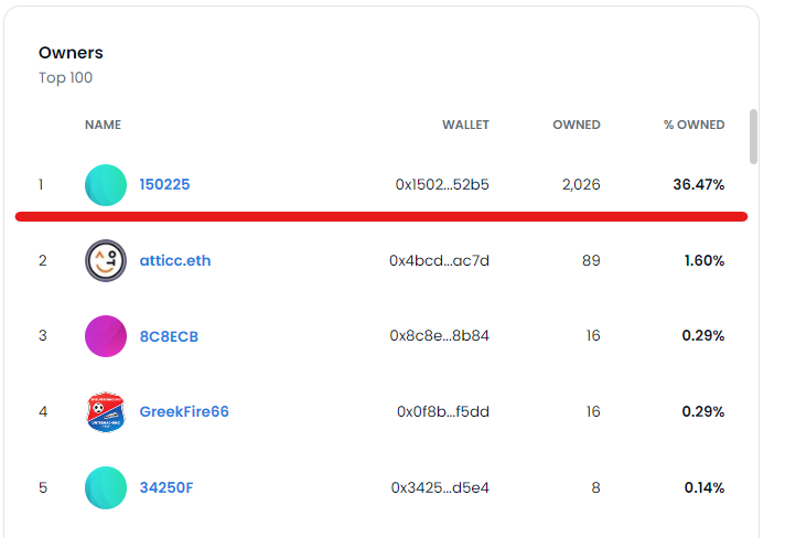 상식적으로 가장 많이 보유한 지갑에 들어있는 NFT 물량이 35%가 넘어가는 것은 말이 안된다고 생각했기 때문에 찾아보았더니 스테이킹 한 물량에 대해서는 0x150225502FB8A965aC3A986A641d13AD963252B5 으로 전송되는 것으로 보인다.