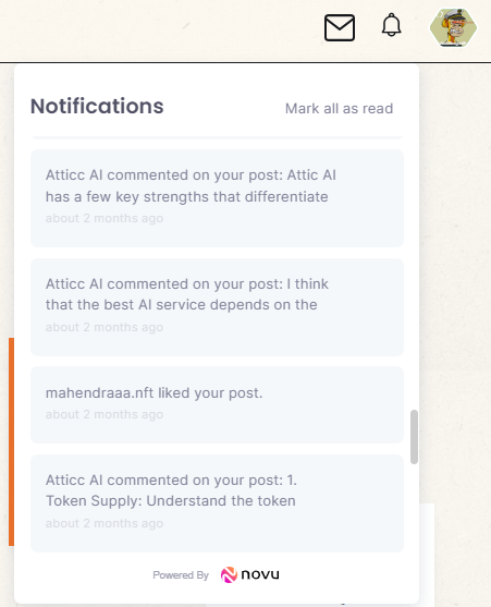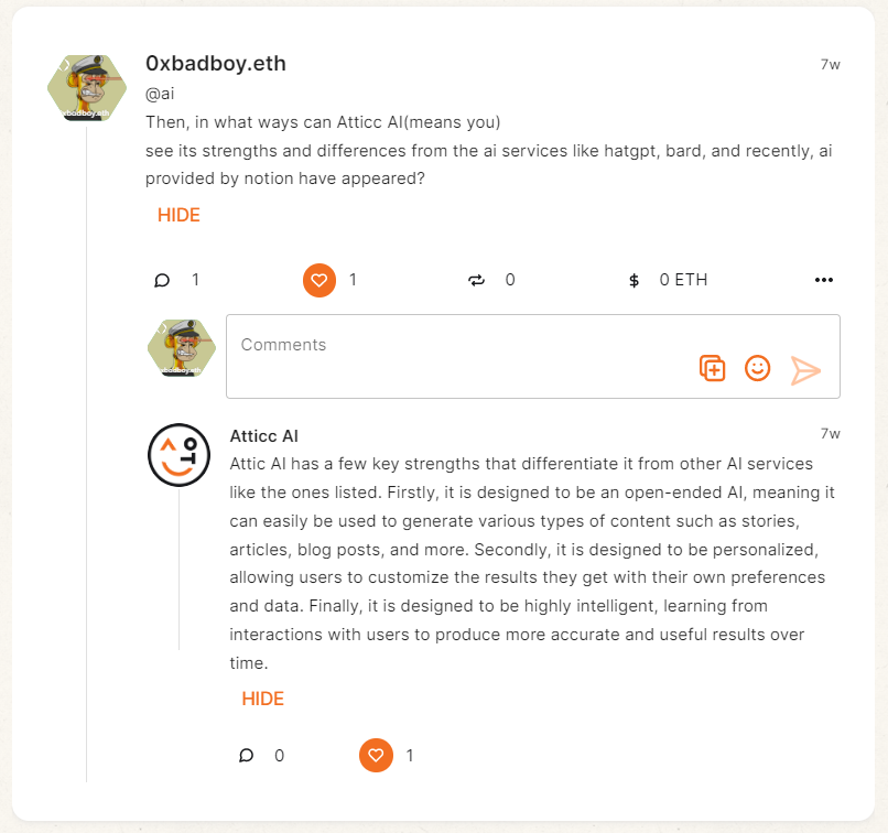 커뮤니티에 글을 작성할 때, @ai 이런식으로 태그를 하고 게시글을 작성하면, Chat GPT를 기반으로 한 Attic AI 가 직접 답변을 해준다. 잘 학습시키고, 잘 작동한다고 하면 정말 Moderator로서 역할도 수행할 수 있겠다는 생각이 든다.