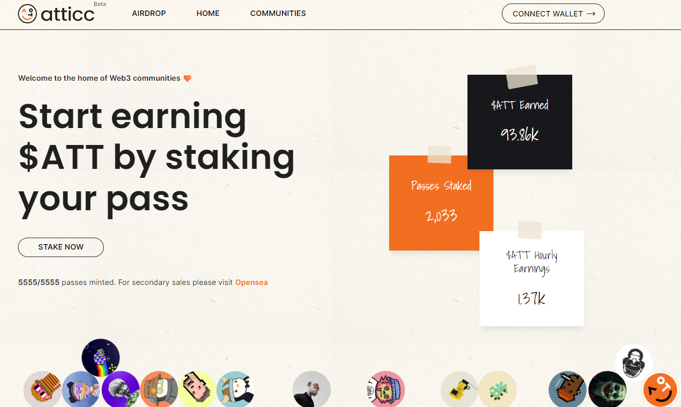 Atticc Early Adopter Pass를 보유하고 해당 멤버십을 atticc.xyz 사이트에 스테이킹하면 보상으로 주어지는 $ATT 토큰이 주어진다. Atticc은 Connect communities in Web3을 미션으로 Web3 커뮤니티를 다 연결시키겠다는 목표를 기반으로 웹사이트가 만들어져 있다. 그리고 끊임없이 업데이트되고 있다.
