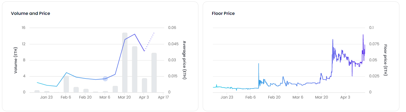 nftgo 자료나 opensea의 analytics 자료를 보면, 거래량과 Floor Price(바닥가) 모두 우상향하고 있는 것을 알 수 있다.