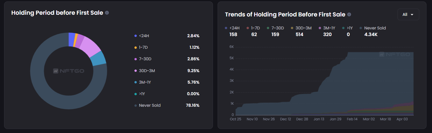 또한 75% 이상의 홀더들이 구매(민팅 또는 C2C) 이후에 홀딩한 기간으로 "Never Sold"로 추가 거래를 하지 않았다. 이 말은 즉슨, 대부분은 트레이딩 목적으로 구매한 것이 아닌 보유를 목적으로(또는 토큰 에어드랍 이후에 판매할 전략으로) 구매했다는 것을 알 수 있다.
